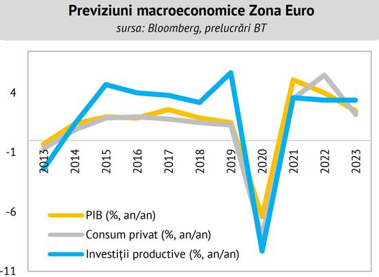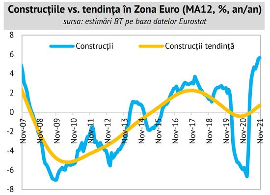 "In dinamica an/an, indicatorul PMI din sectorul de constructii din Zona Euro a crescut pentru a 11-a luna la rand in ianuarie, cu un ritm in intensificare la 12,5 puncte. Evolutia exprima perspective favorabile pentru dinamica sectorului de constructii din trimestrele urmatoare - continuarea tendintei de crestere peste ritmul potential. Cele mai recente previziuni macroeconomice agregate de Bloomberg indica perspectiva cresterii economiei Zonei Euro cu ritmuri anuale de 5,1% in 2021, 4% in 2022, respectiv 2,5% in 2023. Acest scenariu are la baza perspectivele favorabile pentru investitiile productive (dinamici anuale de 3,6% in 2021 si 3,4% in 2022-2023), cu impact de antrenare. Pentru consumul privat din regiune Bloomberg previzioneaza majorare cu rate anual de 3,5% in 2021, 5,5% in 2022, respectiv 2,2% in 2023", subliniaza dr. Andrei Radulescu in analiza.