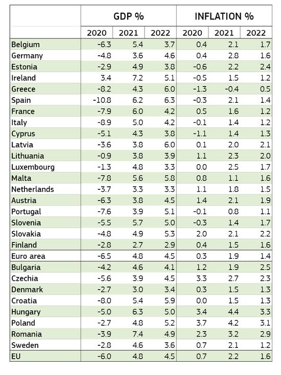In consecinta, se preconizeaza in prezent ca inflatia in UE va fi in medie de 2,2% in acest an (+0,3 puncte procentuale fata de previziunile din primavara) si de 1,6% in 2022 (+0,1 puncte procentuale). In zona euro, inflatia se va situa, conform previziunilor, in medie la 1,9% in 2021 (+0,2 puncte procentuale) si la 1,4% in 2022 (+0,1 puncte procentuale).