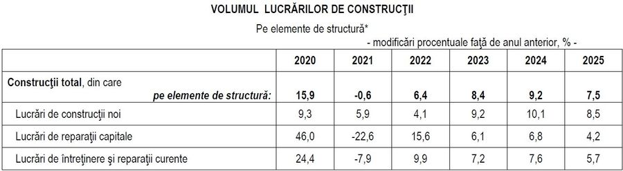Pe elemente de structura, productia din constructii va inregistra, in 2022 o crestere de 4,1% la constructiile noi, de +15,6% la lucrarile de reparatii capitale si de +9,9% la cele de intretinere si reparatii curente. Pentru 2023, estimarile indica majorari pe toate segmentele, respectiv +9,2% la constructiile noi, +6,1% la lucrarile de reparatii capitale si +7,2% la cele de intretinere si reparatii curente.