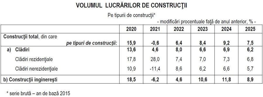 Pe tipuri de constructii, prognoza indica, pentru 2022, o crestere de 8% pe componenta de cladiri (+7,4% la imobilele rezidentiale, +8,6% la cele nerezidentiale) si o evolutie de +4,6% a constructiilor ingineresti, ce includ si lucrarile de infrastructura publica. In 2023, constructiile de cladiri sunt estimate sa creasca cu 6,6% (+7% rezidentiale si +6,2% nerezidentiale), in timp ce constructiile ingineresti ar urma sa creasca cu 10,6%.