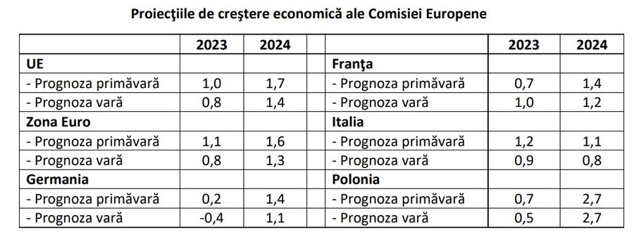In Franta economia va avansa peste asteptari in 2023 (+1%), pe seama performantei productiei industriale si a exporturilor nete din prima jumatate a anului si va continua intr-un ritm moderat anul viitor (+1,2%), sustinut de cererea interna.