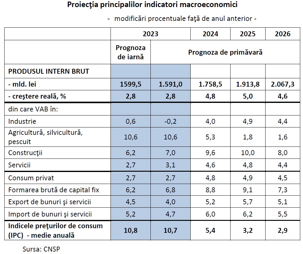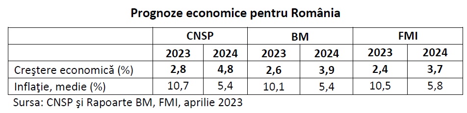 Economia romaneasca va avansa cu 2,4% in 2023 si va accelera pana la 3,7% anul urmator. In ceea ce priveste evolutia preturilor de consum in Romania, estimarile FMI pentru acest an au fost revizuite usor in jos pana la 10,5%, dupa care se asteapta ca inflatia sa revina pe un trend descendent, pentru anul 2024 preturile fiind prognozate a se majora cu 5,8%. Deficitul de cont curent se poate imbunatati pana la (7,9%-7,7%) din PIB in perioada 2023-2024. Rata somajului va ramane la un nivel asemanator celui din anul trecut (5,6%), urmand a se diminua usor in 2024 (5,4%). Potrivit Bancii Mondiale, dinamica economiei in Romania va incetini la 2,6% in 2023 si se va indrepta spre o medie de 4% in 2024-2025, fiind influentata de mai multi factori, printre care efectele de propagare a razboiului din Ucraina care au impact asupra economiei europene, inflatia de baza persistenta si volatilitatea suplimentara a preturilor la energie si la produse alimentare. Capacitatea Romaniei de a absorbi eficient fondurile UE va fi esentiala pentru o redresare durabila, verde si favorabila incluziunii. Fondurile considerabile si reformele structurale asociate ar trebui, de asemenea, sa atenueze partial impactul ratelor mai mari ale dobanzilor si pe cel al incertitudinii asupra investitiilor private. Comisia Europeana urmeaza sa publice la mijlocul lunii mai prognoza de primavara, dupa ce in editia de iarna estimarea cresterii economice in 2023-2024 pentru Romania a fost revizuita ascendent la 2,5%-3,0%.