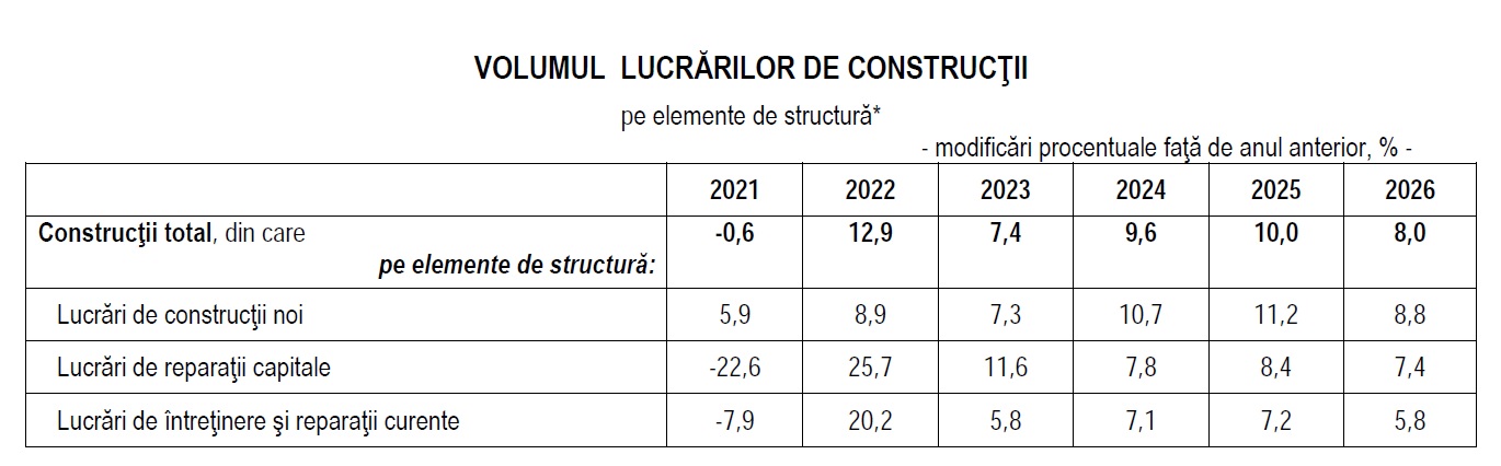 Pe elemente de structura, productia din constructii va inregistra, in 2023 o crestere de 7,3% la constructiile noi, de +11,6% la lucrarile de reparatii capitale si de +5,8% la cele de intretinere si reparatii curente. Pentru 2024, estimarile indica majorari pe toate segmentele, respectiv +10,7% la constructiile noi, +7,8% la lucrarile de reparatii capitale si +7,1% la cele de intretinere si reparatii curente.