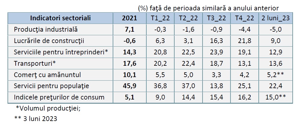 De altfel, productia industriala s-a contractat cu 5% in primele doua luni din 2023 comparativ cu perioada similara a anului 2022, intr-un ritm mai accentuat cu 0,6 puncte procentuale fata de cel din trimestrul IV 2022 (-4,4%). Evolutia s-a datorat incetinirii activitatii in productia si furnizarea de energia electrica si termica, gaze, apa calda (-12,3%), in conditiile unei cereri reduse din partea populatiei si industriilor energofage, si in industria prelucratoare (-3,9%), in timp ce productia din industria extractiva a avansat cu (1,2%).