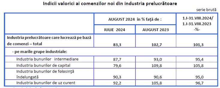 In ceea ce priveste activitatea din primele 8 luni ale acestui an, comenzile noi din industria prelucratoare, au crescut in termeni nominali, pe ansamblu, comparativ cu perioada corespunzatoare din 2023, cu 1,3%, datorita majorarii inregistrate in industria bunurilor de capital (+5,8%). Scaderi au consemnat industria bunurilor de folosinta indelungata (-5%), cea a bunurilor intermediare (-4,6%) si industria bunurilor de uz curent (-3,3%).