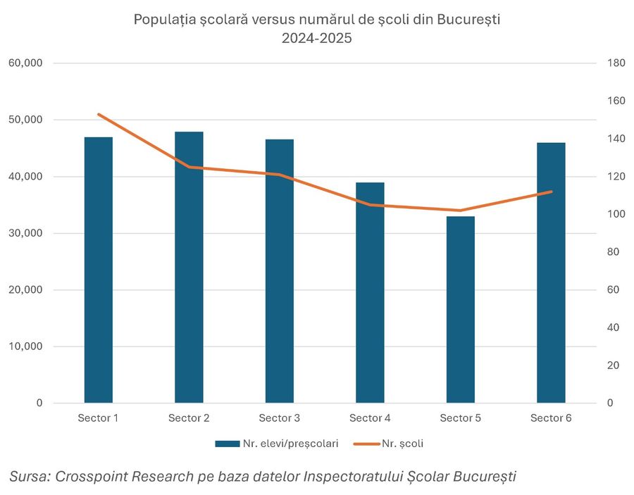 Bucurestiul numara 718 unitati de invatamant preuniversitar in 2025, potrivit unei analize realizate de Crosspoint Real Estate, Asociat International al Savills in Romania, pe baza datelor Inspectoratului Scolar al Municipiului Bucuresti. Distributia capacitatii si ritmul de construire al scolilor nu tin insa pasul cu noile dezvoltari rezidentiale. Sectorul 1 are cea mai dezvoltata retea (153 institutii) si al doilea cel mai mare numar de elevi si prescolari (46.967), iar raportul elevi/unitate oscileaza de la 307 in S1 la 411 in S6. La nivel european, intervalul considerat optim este 250-400, in timp ce Romania se afla in jurul a 440 elevi/scoala.