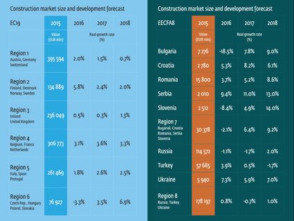 Piata constructiilor din Romania, evaluata la circa 15,8 miliarde euro in 2015 (valoare ce include sectorul materialelor de constructii) ar putea creste cu 5,2% in 2017, potrivit estimarilor Eastern European Construction Forecasting Association (EECFA), organizatie ce realizeaza periodic prognoze referitoare la evolutia pietelor de constructii din 8 tari ale Europei Centrale si de Est, centralizand date din Romania, Bulgaria, Federatia Rusa, Serbia, Slovenia, Croatia, Turcia si Ucraina. Pentru 2018, previziunile EECFA indica o noua majorare pe piata locala a constructiilor, de circa 8,6%. Ritmul de evolutie a pietei locale se va intensifica, astfel, in anii urmatori, dupa o majorare de 3,7% estimata pentru 2016. Conform aceleiasi asociatii, piata est-europeana de constructii este evaluata la 250 miliarde euro anual.Astfel, potrivit calculelor realizate pe baza indicatorilor EECFA, piata de constructii din Romania ar urma sa ajunga la 16,38 miliarde euro la finele acestui an, valoare ce se va majora, anual, pana la 17,2 miliarde euro in 2017, respectiv la 18,7 miliarde euro in 2018 (sume ce includ sectorul materialelor de constructii).