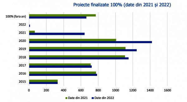 Potrivit datelor centralizate de EFOR, la inceputul anului 2021, 5.989 de proiecte erau finalizate din punct de vedere al deconturilor dintr-un total de 11.753 de proiecte. Alte aproape 3.000 erau finalizate in procent de peste 50%. In 2022, numarul a crescut la 7.905 proiecte implementate financiar peste 90%, valorand 23 miliarde lei, dintre care 6.838 sunt finalizate in procent de 100%, avand o valoare de 19 miliarde lei; 338 de proiecte au fost implementate intre 1% si 10%, insumand alocari de 1,9 miliarde lei, cel mai vechi fiind semnat in martie 2015; 1.247 proiecte sunt implementate intre 1 si 50%, insumand alocari de 8,8 miliarde lei; 1.029 proiecte sunt implementate intre 51 si 75%, insumand alocari de 6,3 miliarde lei.