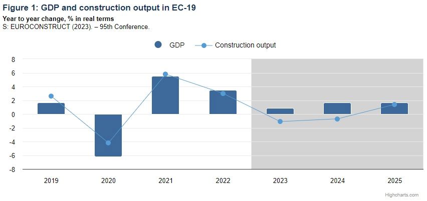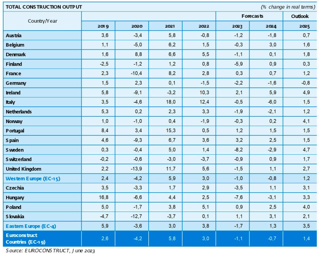 Conform prognozei actuale, productia rezidentiala totala in 2023 in tarile Euroconstruct va fi mai mica decat in 2022, tendinta ce se va mentine inca cel putin un an. Se preconizeaza ca tarile din estul Europei (EC-4, respectiv Cehia, Ungaria, Polonia si Slovacia) vor inregistra o scadere mai accentuata fata de statele Occidentale (EC-15) si ca recuperarea pentru ambele regiuni ar putea incepe in 2025.
