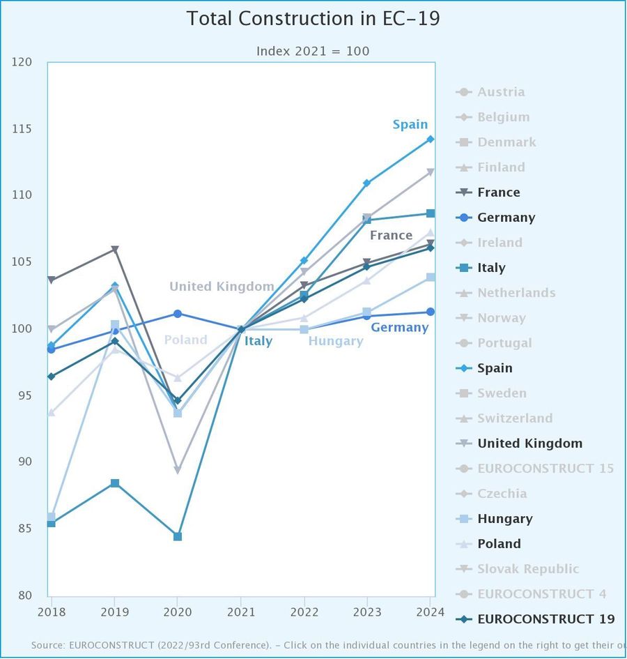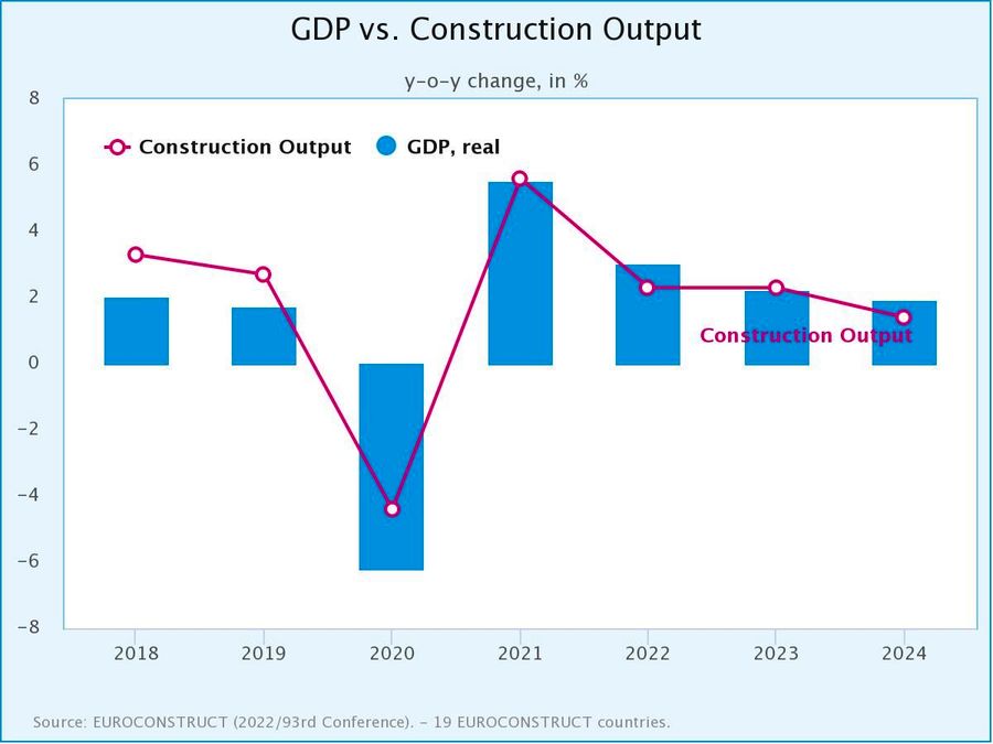 Toate cele trei segmente principale ale pietei constructiilor din tarile CE-19 vor creste in termeni reali in 2022-2024, dar perspectivele sunt destul de moderate, deoarece ratele anuale de crestere estimate sunt de 2% pana la 3%. Dinamica se aplica atat constructiilor de cladiri si civile, cat si proiectelor de renovare. Evolutia relativ scazuta a constructiilor in perioada de prognoza reflecta nivelul ridicat de incertitudine cu privire la directia evolutiilor economice ulterioare in tarile europene.
