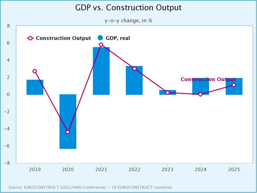 Potrivit datelor prezentate la Euroconstruct, urmeaza doi ani dificili pentru industria de constructii de pe continent, cu prognoze de stagnare in 2023 (+0,2%) si in 2024 (0%). Estimarile au fost revizuite in sens negativ, dupa ce in vara acestea indicau evolutii medii de 2% pe an in 2023 si 2024. In pofida unei evolutii de 3% indicate pentru anul in curs, industria europeana de constructii va intra pe o panta descrescatoare, ca volum de activitate, iar o revigorare nu este asteptata mai devreme de 2025.