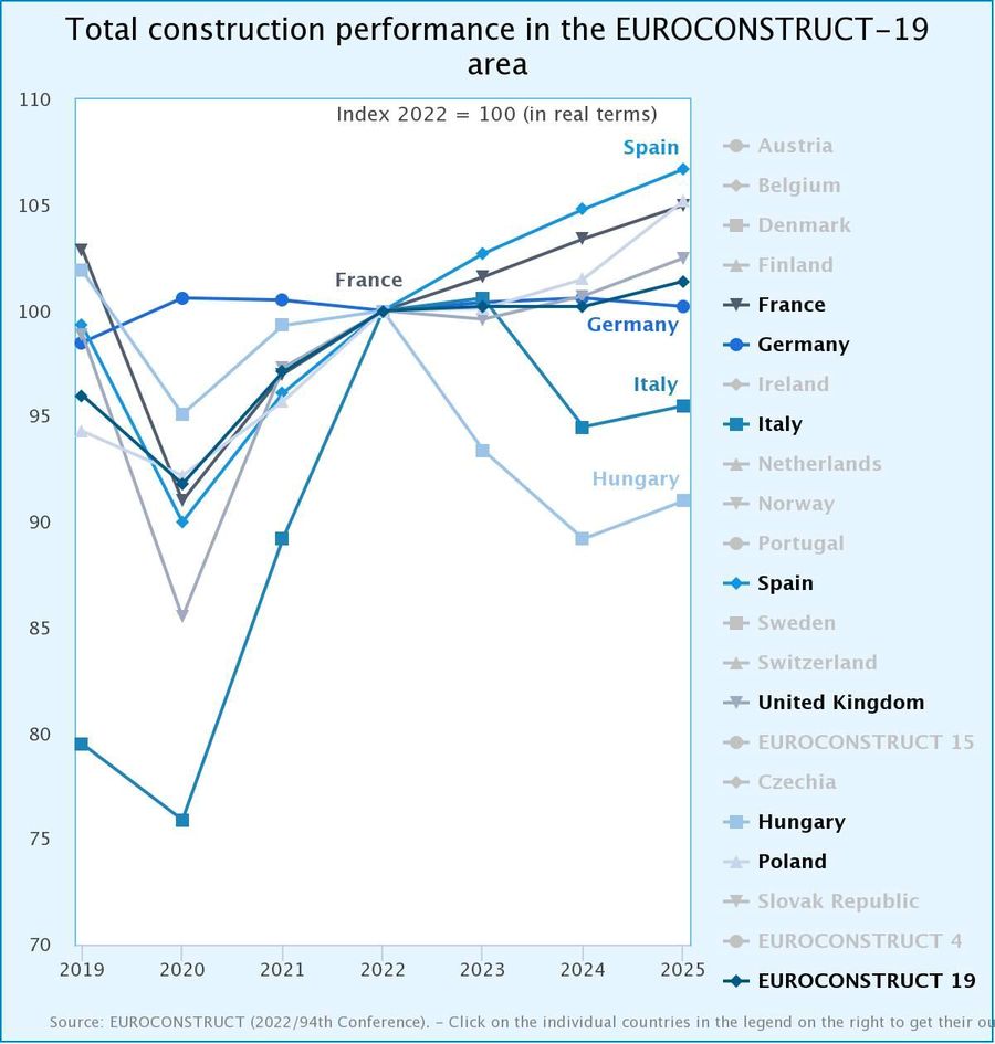 Italia a reprezentat cea mai performanta piata de constructii din spatiul Euroconstruct in 2021, cu un nivel ridicat de crestere de 12,1%, determinat in parte de subventiile UE. Marea Britanie, in prezent una dintre economiile cu cele mai slabe performante din Europa, se confrunta cu un ciclu negativ de crestere a productiei de constructii in 2023 (-0,4%), alaturi de Germania, care intampina, la randul sau, o perspectiva de crestere negativa sau stagnanta pana in 2025 (-0,4%).