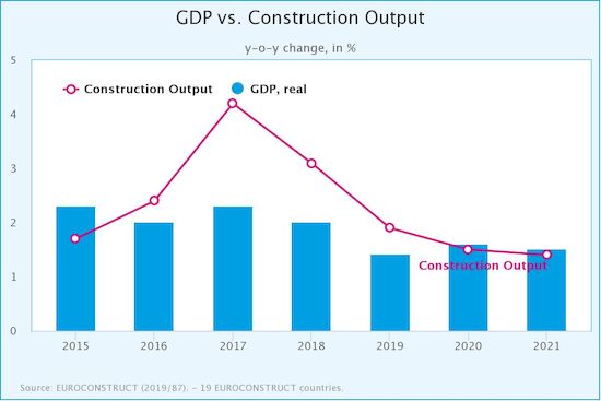 Productia din domeniul constructiilor din spatiul celor 19 piete Euroconstruct a crescut cu 3,1% in 2018 fata de nivelul anului anterior, rezultatul fiind peste asteptarile analistilor. Valoric, piata din regiune a depasit 1,61 miliarde euro, fiind inregistrat al cincilea an consecutiv de crestere.Cele 19 tari care intra in spatiul Euroconstruct sunt: Austria, Belgia, Danemarca, Finlanda, Franta, Germania, Irlanda, Italia, Olanda, Norvegia, Portugalia, Spania, Suedia, Elvetia, Marea Britanie, Cehia, Ungaria, Polonia si Slovacia.