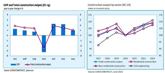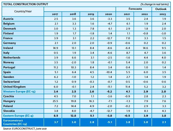 Recuperarea industriei europene de constructii este mult mai rapida decat se estima initial, cea mai mare parte a pierderilor generate de pandemia de coronavirus urmand a fi recuperate in 2021. Potrivit celor mai recente estimari, volumul lucrarilor de constructii din zona Euroconstruct va creste cu 3,8% in 2021, dupa contractia de 5,1% confirmata pentru 2020. Cele 19 tari monitorizate de Euroconstruct sunt Austria, Belgia, Danemarca, Finlanda, Franta, Germania, Irlanda, Italia, Olanda, Norvegia, Portugalia, Spania, Suedia, Elvetia, Marea Britanie, Cehia, Ungaria, Polonia si Slovacia si genereaza peste 90% din valoarea pietei europene de constructii."Comparativ cu perviziunile anterioare, declinul din 2020 a fost mai putin sever decat ne-am asteptat, nivelul anterior crizei urmand a fi atins in 2022. Pe fondul conditiilor economice semnificativ mai bune din cele 19 tari Euroconstruct, industria constructiilor beneficiaza, de asemenea, de o redresare economica rapida. Totusi, spre deosebire de anii anteriori, sectorul va inregistra o dinamica de crestere sub ritmul economiei globale incepand din anul 2022. In timp ce ratele de crestere ale industriei de constructii vor fi de +3% in 2022, respectiv +2,1% in 2023, economia din Euroconstruct-19 va inregistra evolutii de +4,4% in 2022, respectiv +2% in 2023", confrom datelor prezentate in cea mai recenta editie a conferintei Euroconstruct, ce a avut loc in luna iunie 2021.