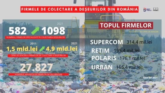 Cele mai mari firme din acest domeniu erau, anul trecut, in functie de cifra de afaceri, SUPERCOM, RETIM ECOLOGIC SERVICE, POLARIS M HOLDING SI URBAN SA, toate cu incasari intre 160 si 300 milioane de lei in 2021.