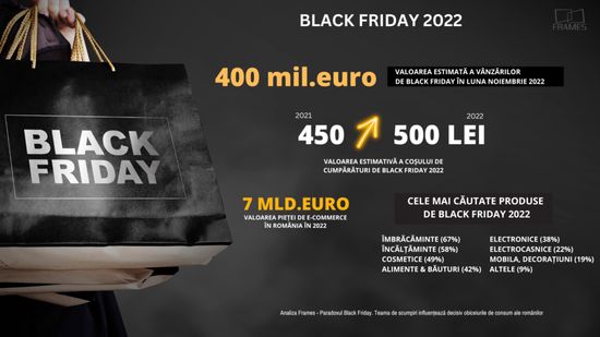 Potrivit estimarilor companiei de consultanta Frames, dupa un an 2021 in care Black Friday a generat incasari de aprox. 350 milioane de euro (la nivelul intregii luni noiembrie /online&offline), in acest an se estimeaza o depasire a bornei de 400 milioane de euro.