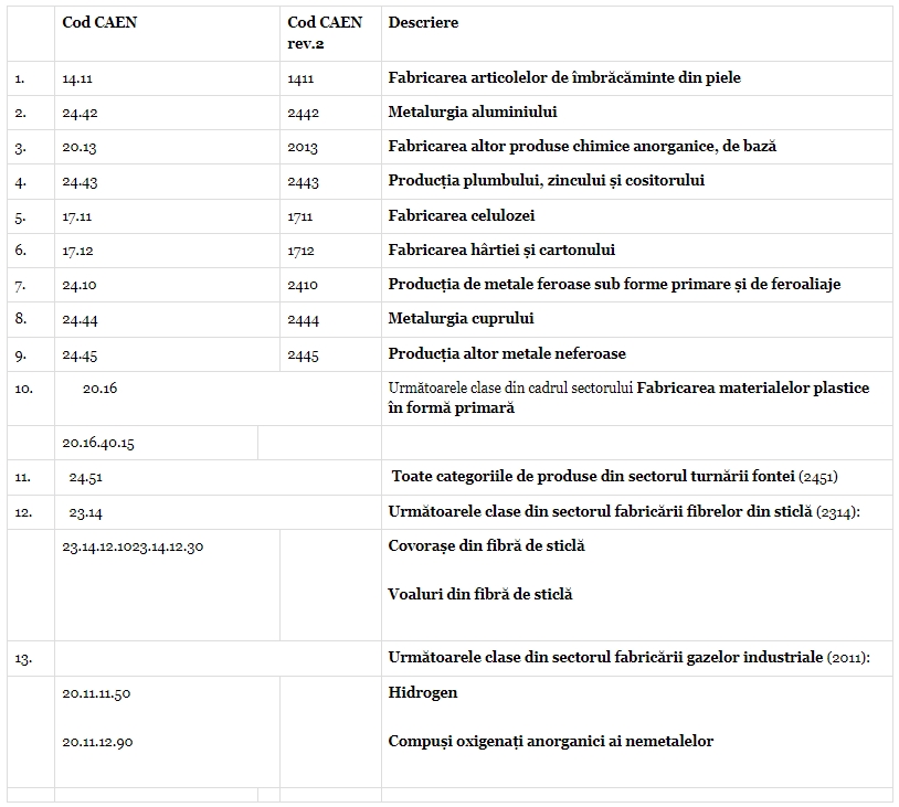 Beneficiarii ajutorului de stat au fost consumatorii energointensivi cu activitate in domeniul pregatirii fibrelor si filarii fibrelor textile, fabricarea articolelor de imbracaminte din piele, fabricarea hartiei si a cartonului, extractia de minereuri feroase, extractia mineralelor pentru industria chimica si a ingrasamintelor naturale, fabricarea produselor de cocserie, fabricarea altlor produse chimice anorganice de baza, fabricarea ingrasamintelor si produselor azotoase, fabricarea fibrelor sintetice si artificiale, productia de metale feroase, sub forme primare, si de feroaliaje, metalurgia aluminiului, productia plumbului, zincului si cositorului, metalurgia cuprului.