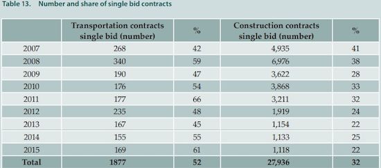 De pilda, din studiul atribuirii contractelor de lucrari publice in perioada 2007-2013 reiese ca 1 din 7 proiecte cu finantare europeana si 1 din 4 proiecte finantate de la bugetul de stat au fost atribuite in urma unor licitatii la care a participat un singur ofertant.