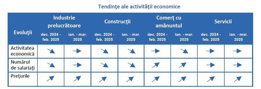 Ca tendinte economice generale, documentul statistic indica, pentru primele trei luni ale acestui an, o relativa stabilitate a activitatii economice si a numarului de salariati in industria prelucratoare si servicii, precum si noi cresteri de preturi in industria constructii si comertul cu amanuntul.