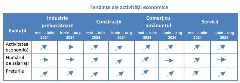 Ca tendinte economice generale, documentul statistic indica o crestere a volumului de activitate in constructii si comertul cu amanuntul, o relativa stabilitate a numarului de salariati in industrie, comertul cu amanuntul si servicii, precum si o majorare a preturilor in constructii si comertul cu amanuntul.