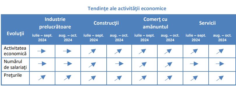Ca tendinte economice generale, documentul statistic indica o crestere moderata a activitatii si comertului cu amanuntul si servicii, o relativa stabilitate a numarului de salariati in industria prelucratoare, constructii si servicii, precum si cresteri de preturi in toate industriile.