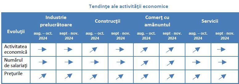 Ca tendinte economice generale, documentul statistic indica o relativa stabilitate a activitatii si a numarului de salariati in industria prelucratoare, constructii si servicii, precum si o crestere a preturilor in constructii si comertul cu amanuntul.