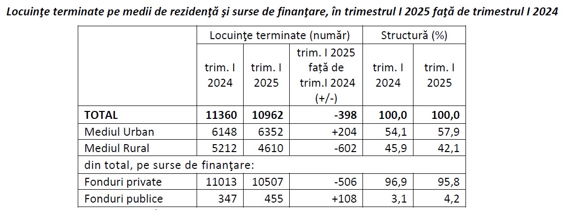 In primul trimestru al anului 2025, la nivel national au fost date in folosinta 10.962 de locuinte, in scadere cu 398 de unitati fata de nivelul din perioada corespunzatoare a anului anterior. Pe medii de rezidenta, in intervalul analizat cele mai multe locuinte au fost construite in mediul urban (57,9%), potrivit celor mai recente date publicate de Institutul National de Statistica (INS). Repartitia pe fonduri de finantare a locuintelor terminate releva faptul ca, in primele 3 luni ale acestui an, fata de trimestrul intai din 2024, numarul locuintelor terminate din fondurile private a scazut cu 506 unitati, iar al celor construite din fonduri publice a crescut cu 108 unitati.Distributia in profil regional evidentiaza o scadere a numarului locuintelor terminate in urmatoarele regiuni de dezvoltare: Nord-Vest (-408 locuinte), Vest (-343), Sud-Est (-180), Sud-Muntenia (-162) si Nord-Est (-52). Cresteri s-au inregistrat in Bucuresti-Ilfov (+657 locuinte), Sud-Vest Oltenia (+76) si Centru (+14).