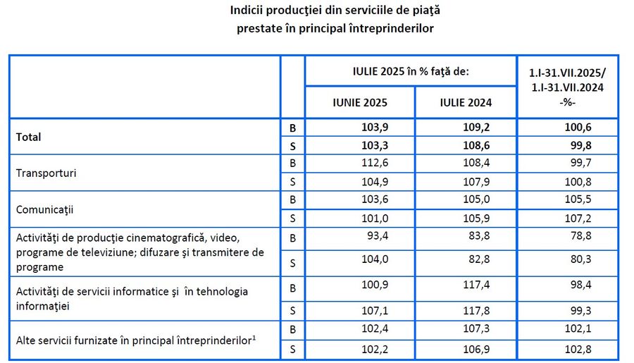 Cifra de afaceri obtinuta din serviciile prestate intreprinderilor de companiile din industria de servicii informatice si de tehnologia informatiei, calculata ca serie bruta, a scazut cu 1,6% in primele 7 luni ale acestui an, raportat la perioada corespunzatoare din 2024. In raport cu luna iulie 2024, in iulie 2025 in acest sector s-a consemnat o crestere bruta de 17,4%, iar fata de luna iunie 2025 o majorare de 0,9%, potrivit celor mai recente date publicate de Institutul National de Statistica (INS).In ansamblu, in perioada ianuarie - iulie 2025, comparativ cu primele 7 luni ale anului anterior, cifra de afaceri din serviciile de piata prestate in principal intreprinderilor, serie bruta, a crescut cu 0,6%, datorita evolutiilor inregistrate la activitatile de comunicatii (+5,5%) si la alte servicii furnizate in principal intreprinderilor (+2,1%). Scaderi au inregistrat activitatile de productie cinematografica, video, programe de televiziune; difuzare si transmitere de programe (-21,2%), activitatile de servicii informatice si in tehnologia informatiei (-1,6%) si cele de transporturi (-0,3%). Ca serie ajustata in functie de numarul de zile lucratoare si de sezonalitate, in acelasi interval, cifra de afaceri din serviciile de piata prestate in principal intreprinderilor a scazut, pe ansamblu, cu 0,2%.