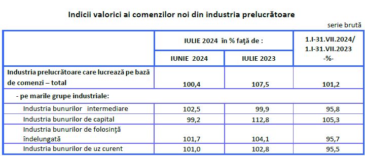 In primele sapte luni ale acestui an, comenzile noi din industria prelucratoare au crescut, in termeni nominali, cu 1,2% fata de nivelul din aceeasi perioada a anului 2023, pe total (piata interna si externa), conform celor mai recente date transmise de Institutul National de Statistica (INS). Evolutia s-a datorat cresterii inregistrate in industria bunurilor de capital (+5,3%). Scaderi au inregistrat industria bunurilor de uz curent (-4,5%), dar si in cele de bunuri de folosinta indelungata (-4,3%) si bunuri intermediare (-4,2%).Datele pentru luna iulie 2024 indica o crestere a comenzilor noi din industria prelucratoare (interna si externa), atat raportat la luna anterioara (+0,4%), cat si la luna iulie 2023 (+7,5%).