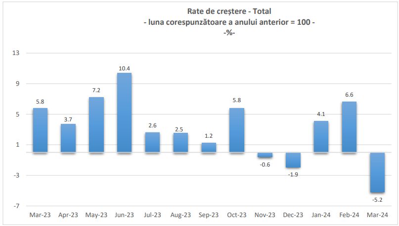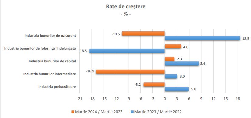 Comenzile noi din industria prelucratoare au crescut in termeni nominali, in luna martie 2024, comparativ cu luna precedenta, pe ansamblu, cu 4,3%, datorita cresterilor inregistrate in industria bunurilor de folosinta indelungata (+12,7%), industria bunurilor de capital (+5,6%) si in industria bunurilor intermediare (+2,5%). Industria bunurilor de uz curent a scazut cu 2,9%, potrivit celor mai recente date publicate de Institutul National de Statistica (INS).In luna martie 2024, comenzile noi din industria prelucratoare au scazut, in termeni nominali, in luna martie 2024, comparativ cu luna corespunzatoare din anul precedent, pe ansamblu, cu 5,2%, ca urmare a scaderilor inregistrate in industria bunurilor intermediare (-16,9%) si in industria bunurilor de uz curent (-10,5%). Cresteri au inregistrat industria bunurilor de folosinta indelungata (+4%) si industria bunurilor de capital (+2,3%).