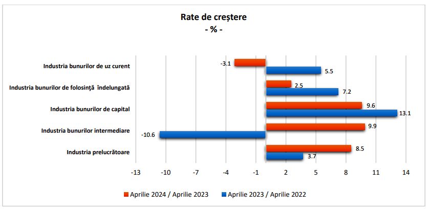 In primele 4 luni ale anului in curs, raportat la perioada corespunzatoare din 2023, comenzile noi din industria prelucratoare, au crescut in termeni nominali, pe ansamblu, cu 3%, datorita evolutiei inregistrate in industria bunurilor de capital (+7,9%), arata cele mai recente date publicate de Institutul National de Statistica (INS). Scaderi au inregistrat industria bunurilor de uz curent (-4,6%), industria bunurilor intermediare (-3,3%) si cea a bunurilor de folosinta indelungata (-1,6%).Comenzile noi din industria prelucratoare au scazut in termeni nominali, in luna aprilie 2024, comparativ cu luna precedenta, pe ansamblu, cu -3,6%, ca urmare a contractiei inregistrate in industria bunurilor de uz curent (-8,8%), industria bunurilor de folosinta indelungata (-7,2%) si in industria bunurilor de capital (-5,1%). Industria bunurilor intermediare a crescut cu 1%.