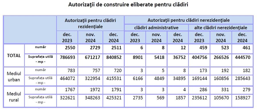 Numarul autorizatiilor de construire eliberate pentru cladiri rezidentiale a crescut cu 2,9% in 2024 fata de anul 2023, la 35.667, arata cele mai recnete date publicate, vineri, de Institutul National de Statistica (INS). Evolutii s-au inregistrat in regiunile Sud-Muntenia (+441 autorizatii), Vest (+375), Bucuresti-Ilfov (+206), Nord-Est (+99), Sud-Est (+20) si Nord-Vest (+10). Scaderi s-au inregistrat in regiunile de dezvoltare Centru (-112 autorizatii) si Sud-Vest Oltenia (-18).In luna decembrie 2024 s-au eliberat 2.511 autorizatii de construire pentru cladiri rezidentiale (-8% fata de luna noiembrie 2024), cu o suprafata utila totala de 840.852 mp (+25,3%). Din totalul acestora, 71,3% sunt pentru zona rurala. In luna decembrie 2024 se evidentiaza o scadere a numarului de autorizatii de construire eliberate pentru cladiri rezidentiale comparativ cu luna precedenta (-218 autorizatii). In profil teritorial, aceasta diminuare este reflectata in regiunile Sud-Est (-84 autorizatii), Vest (-71), Nord-Vest (-62), Bucuresti-Ilfov (-32), Sud-Muntenia (-22), Sud-Vest Oltenia (-6) si Centru (-3). Crestere s-a inregistrat in regiunea de dezvoltare Nord-Est (+62 autorizatii).