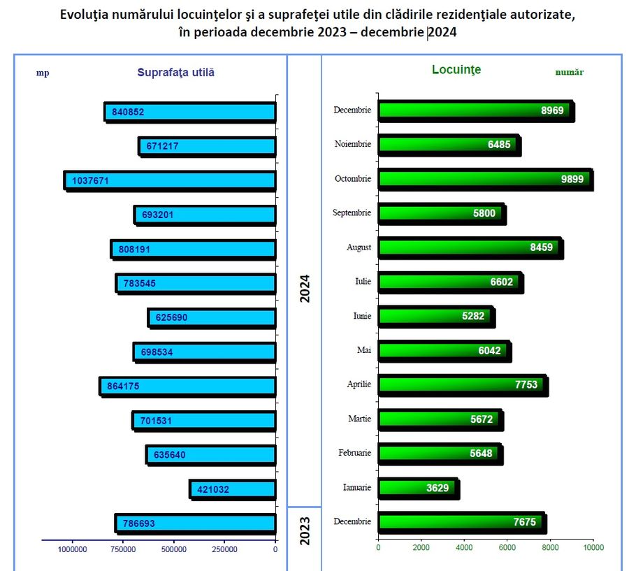 In raport cu luna decembrie 2023, in decembrie 2024 se evidentiaza o scadere a numarului de autorizatii de construire eliberate pentru cladiri rezidentiale (-1,5%) si o crestere a suprafetei utile totale (+6,9%). In profil teritorial, aceasta scadere (-39 autorizatii) este reflectata in regiunile Sud-Vest Oltenia (-77 autorizatii), Nord-Vest (-52), Bucuresti-Ilfov (-18) si Vest (-16). Cresteri s-au inregistrat in regiunile Centru (+60 de autorizatii), Sud-Muntenia (+50) si Sud-Est (+14). In regiunea Nord-Est s-a eliberat acelasi numar de autorizatii ca in decembrie 2023, adica 541 de permise.