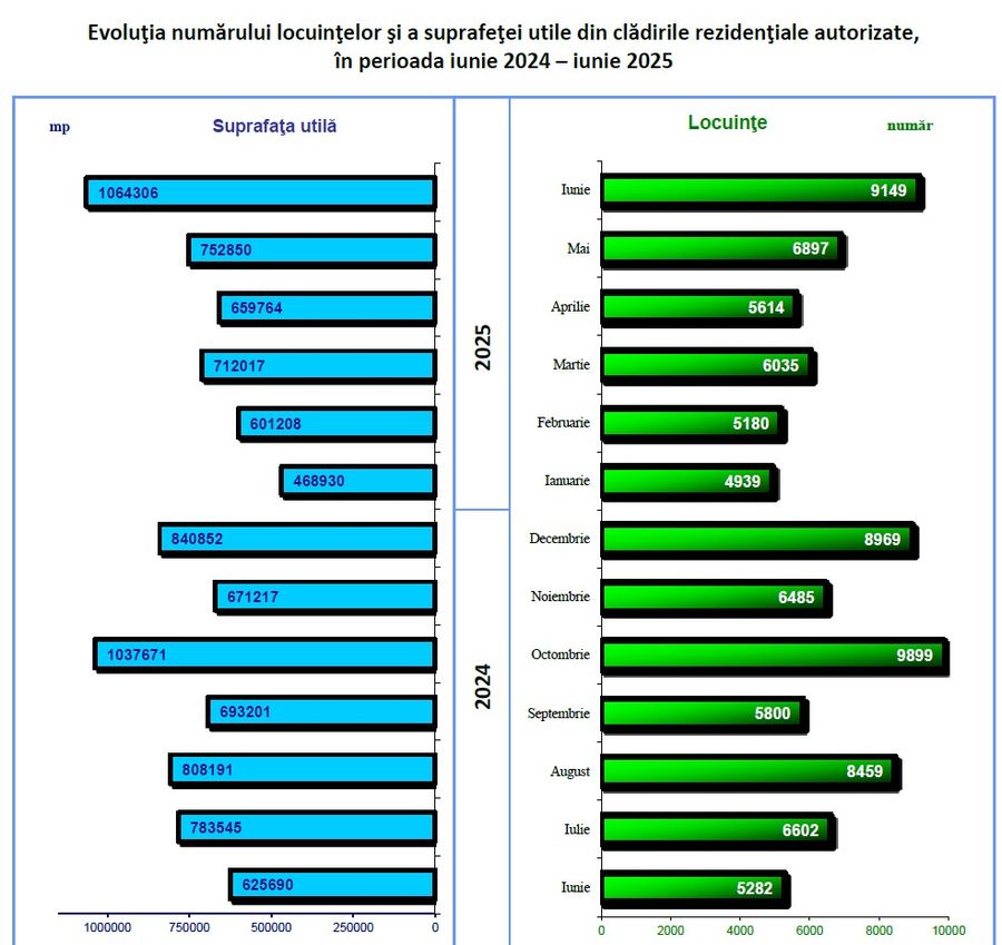 In luna iunie 2025 se evidentiaza o crestere atat a numarului de autorizatii de construire eliberate pentru cladiri rezidentiale (+21,9%), cat si a suprafetei utile totale (+70,1%) comparativ cu luna iunie 2024. In profil teritorial, aceasta evolutie (+630 de autorizatii) este reflectata in regiunile Nord-Est (+204 autorizatii), Vest (+136), Nord-Vest (+110), Centru (+99), Sud-Muntenia (+61) si Sud-Vest Oltenia (+32). Scaderi s-au inregistrat in regiunile de dezvoltare Sud-Est (-9 autorizatii) si Bucuresti-Ilfov (-3).