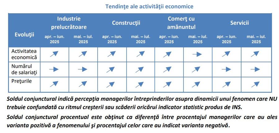 Ca tendinte economice generale, documentul statistic indica, pentru perioada mai - iulie 2025, o crestere moderata a activitatii economice in industria prelucratoare si servicii, dar si a numarului de salariati in constructii si comertul cu amanuntul. De asemenea, este previzibila o crestere a preturilor in industria prelucratoare, constructii si servicii.