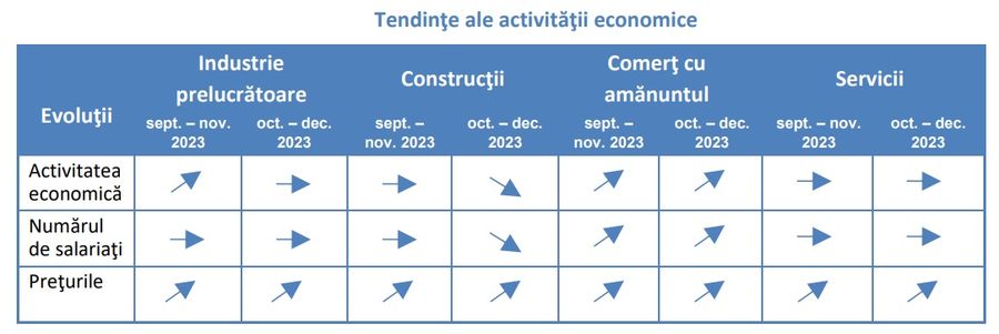 Ca tendinte economice generale, documentul statistic indica o relativa stabilitate a activitatii in industria prelucratoare si in servicii, scadere moderata a numarului de salariati in constructii si crestere a preturilor in constructii si comertul cu amanuntul.