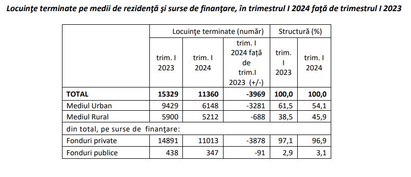 Pe medii de rezidenta, in trimestrul I 2024, cele mai multe locuinte au fost construite in mediul urban (54,1%). Repartitia pe fonduri de finantare a locuintelor terminate releva faptul ca, in trimestrul I 2024, fata de trimestrul I 2023, numarul locuintelor terminate a scazut atat din fondurile private cu 3.878 locuinte, cat si din fondurile publice cu 91 locuinte.