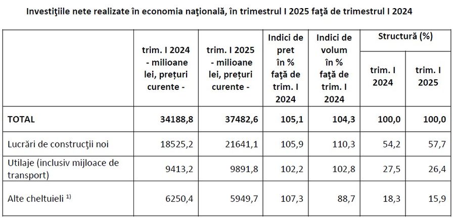 In primul trimestru al anului 2025, investitiile nete realizate in economia nationala au insumat 37,48 miliarde lei (circa 7,4 miliarde euro), in crestere cu 4,3%, comparativ cu perioada corespunzatoare din 2024, potrivit celor mai recente date publicate de Institutul National de Statistica (INS). Din total, investitiile in lucrarile noi de constructii au crescut cu 10,3%, la 21,64 miliarde lei (aproape 4,3 miliarde euro), iar cele in utilaje (inclusiv mijloace de transport) au avansat cu 2,8%, la aproape 9,9 miliarde lei (1,96 miliarde euro). Sumele incluse la categoria "alte cheltuieli" au crescut, in trimestrul I al acestui an, cu 11,3%, pana la aproape 6 miliarde lei. Aici sunt calculate cheltuielile pentru lucrari geologice si de foraj, pentru cumpararea animalelor de munca, de productie si reproductie, plantatii de vita de vie, pomi, impaduriri, cheltuieli pentru achizitionarea obiectelor de inventar gospodaresc de natura mijloacelor fixe, cheltuieli pentru studiile de cercetare si proiectare legate de obiectivele de investitii si pentru serviciile aferente transferului de proprietate.
