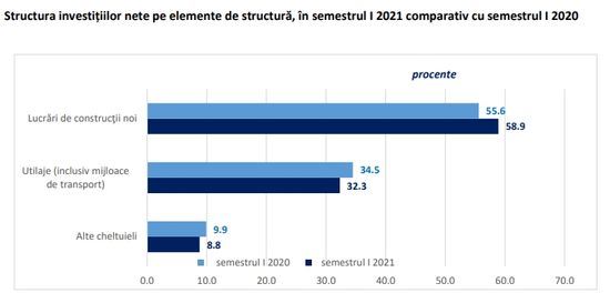 In trimestrul II 2021, comparativ cu trimestrul II 2020, investitiile nete realizate in economia nationala au crescut cu 12,2%, crestere inregistrata la toate elementele de structura: lucrari de constructii noi cu 19,8%, utilaje (inclusiv mijloace de transport) cu 2,6% si la alte cheltuieli cu 1,9%.