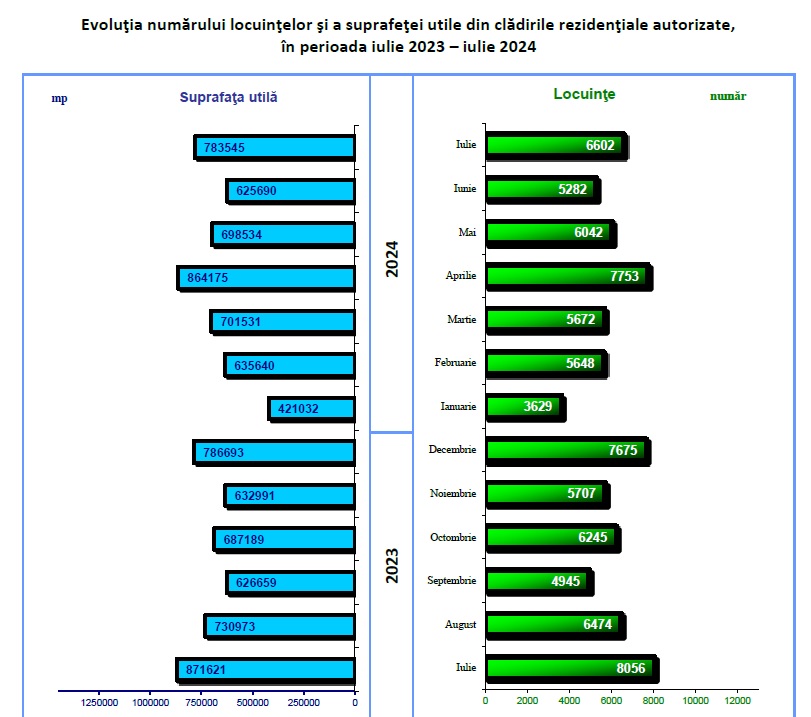 Comparativ cu luna iulie 2023, in iulie 2024 datele INS evidentiaza o crestere a numarului de autorizatii de construire eliberate pentru cladiri rezidentiale (+14,1%) si o scadere a suprafetei utile totale (-10,1%) comparativ cu luna iulie 2023. In profil teritorial, aceasta evolutie (+431 autorizatii) este reflectata in regiunile Nord-Vest (+155 autorizatii), Sud-Muntenia (+141), Vest (+84), Bucuresti-Ilfov (+24), Nord-Est si Sud-Est (+22 fiecare) si Centru (+10). Scadere s-a inregistrat in regiunea de dezvoltare Sud-Vest Oltenia (-27 autorizatii).