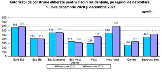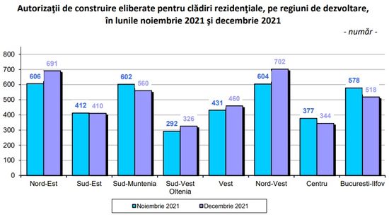 "In luna decembrie 2021 se evidentiaza o crestere a numarului de autorizatii de construire eliberate pentru cladiri rezidentiale (+109 autorizatii), comparativ cu luna precedenta. In profil teritorial, aceasta crestere este reflectata in urmatoarele regiuni de dezvoltare: Nord-Vest (+98 autorizatii), Nord-Est (+85), Sud-Vest Oltenia (+34) si Vest (+29). Scaderi s-au inregistrat in urmatoarele regiuni de dezvoltare: Bucuresti-Ilfov (-60 autorizatii), Sud-Muntenia (-42), Centru (-33) si Sud-Est (-2)", se arata in comunicatul INS.