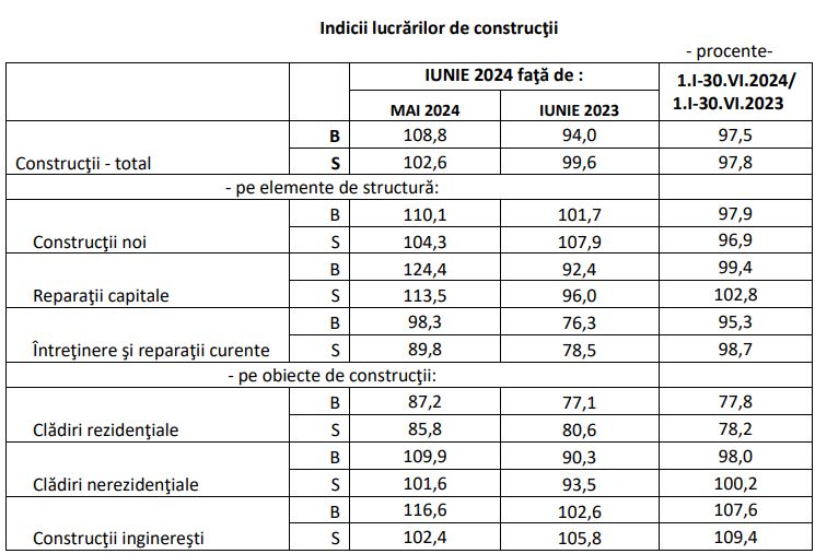 In luna iunie 2024, volumul lucrarilor de constructii a crescut, fata de luna mai 2024, ca serie bruta, cu 8,8%, iar ca serie ajustata in functie de numarul de zile lucratoare si de sezonalitate, cu 2,6%. Ca serie bruta, cresterea este evidentiata la lucrarile de reparatii capitale (+24,4%) si la constructiile noi (+10,1%). Lucrarile de intretinere si reparatii curente au scazut cu 1,7%. Pe obiecte de constructii, au avut loc cresteri la lucrarile de constructii ingineresti (+16,6%) si la cladirile nerezidentiale (+9,9%). Cladirile rezidentiale au scazut cu 12,8%.