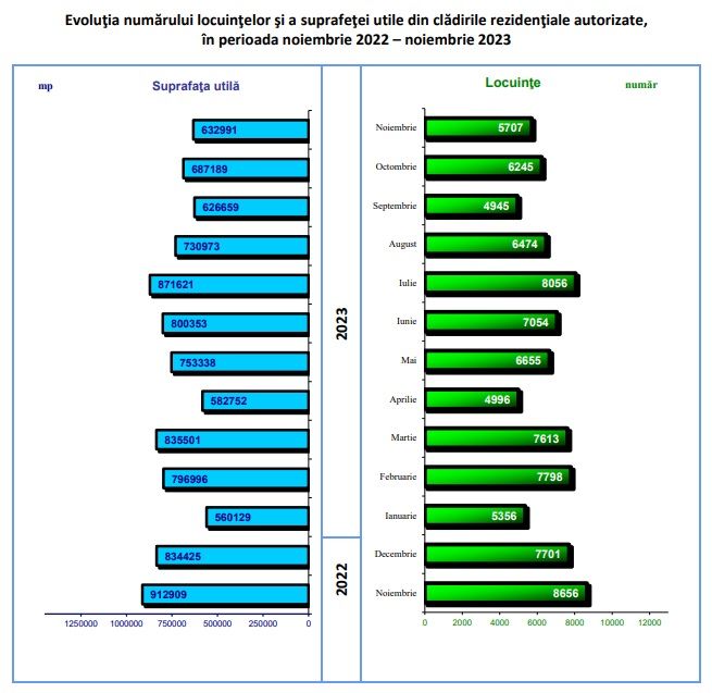 Comparativ cu noiembrie 2022, in noiembrie 2023 se evidentiaza o scadere atat a numarului de autorizatii de construire eliberate pentru cladiri rezidentiale (-15,1%) cat si a suprafetei utile totale (-30,7%), comparativ cu luna noiembrie 2022. In profil teritorial, aceasta scadere a numarului de autorizatii de construire eliberate pentru cladiri rezidentiale (-479 autorizatii) este reflectata in toate regiunile de dezvoltare: Nord-Est (-131 autorizatii), Bucuresti-Ilfov (-115), Sud-Est (-61), Nord-Vest (-52), Sud-Vest Oltenia (-41), Sud-Muntenia (-34), Centru (-24) si Vest (-21).
