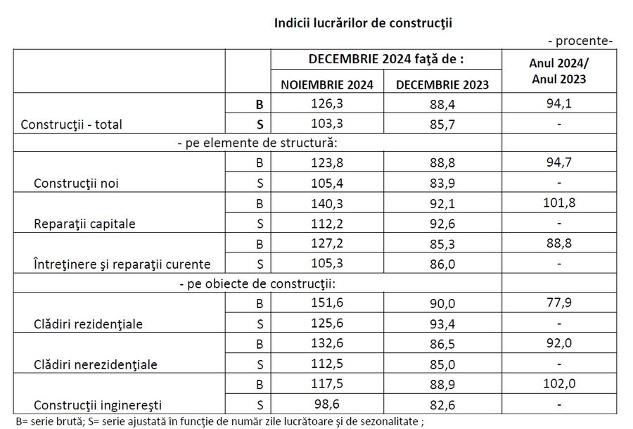 In 2024, volumul lucrarilor de constructii a scazut, fata de anul 2023, ca serie bruta, cu 5,9%, diminuare inregistrata la lucrarile de intretinere si reparatii curente (-11,2%) si la lucrarile de constructii noi (-5,3%). Lucrarile de reparatii capitale au crescut cu 1,8%, informeaza Institutul National de Statistica (INS). Pe obiecte de constructii, s-au inregistrat scaderi la cladirile rezidentiale (-22,1%) si nerezidentiale (-8%), in timp ce constructiile ingineresti au crescut cu 2%.In luna decembrie 2024, in raport cu luna anterioara, noiembrie 2024, volumul lucrarilor de constructii a crescut, ca serie bruta, cu 26,3%, evolutie evidentiata la lucrarile de reparatii capitale (+40,3%), lucrarile de intretinere si reparatii curente (+27,2%) si la constructiile noi (+23,8%). Pe obiecte de constructii, s-au inregistrat cresteri la cladirile rezidentiale (+51,6%), la cele nerezidentiale (+32,6%) si la lucrarile de constructii ingineresti (+17,5%).