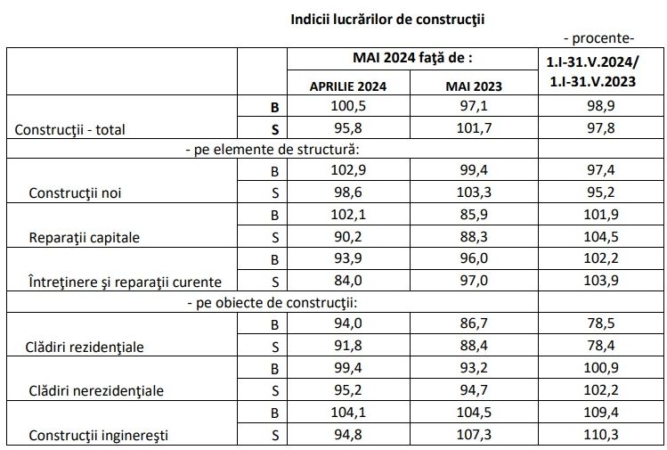In luna mai 2024, raportat la aprilie 2024, volumul lucrarilor de constructii a crescut, ca serie bruta, cu 0,5%, evolutie evidentiata la lucrarile de constructii noi (+2,9%) si la cele de reparatii capitale (+2,1%). Lucrarile de intretinere si reparatii curente au scazut cu 6,1%, potrivit celor mai recente date publicate de Institutul National de Statistica (INS). Pe obiecte de constructii, a avut loc o crestere la lucrarile de constructii ingineresti (+4,1%). Cladirile rezidentiale si cladirile nerezidentiale au scazut cu 6%, respectiv cu 0,6%.In acelasi interval, ca serie ajustata in functie de numarul de zile lucratoare si de sezonalitate, volumul lucrarilor de constructii a scazut cu 4,2%, contractie inregistrata astfel: lucrarile de intretinere si reparatii curente (-16%), lucrarile de reparatii capitale (-9,8%) si la lucrarile de constructii noi (-1,4%). Pe obiecte de constructii, volumul lucrarilor de constructii a scazut la cladirile rezidentiale (-8,2%), constructiile ingineresti (-5,2%) si la cladirile nerezidentiale (-4,8%).