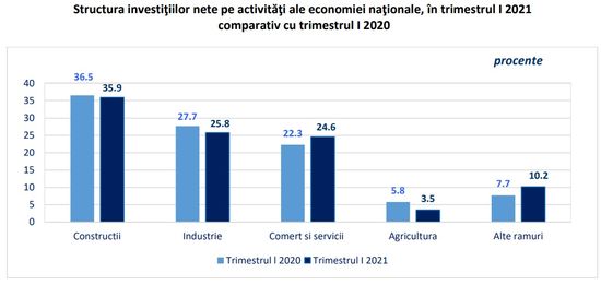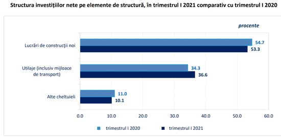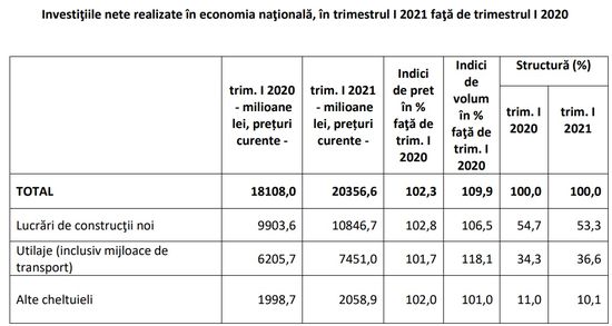 In primul trimestru din 2021, investitiile nete realizate in economia nationala au insumat 20,35 miliarde lei, in crestere cu 9,9% comparativ cu perioada corespunzatoare din 2020. Potrivit unor date publicate de Institutul National de Statistica (INS), valoarea cumulata a investitiilor nete in lucrari de constructii noi s-a plasat la 9,9 miliarde lei (peste doua miliarde euro), fiind cu 6,5% mai mare fata de nivelul din intervalul ianuarie-martie 2020.Totodata, investitiile in utilaje (inclusiv mijloace de transport) s-au majorat cu 18,1%, la 6,2 miliarde lei, diferenta fiind reprezentata de alte cheltuieli (circa doua milioane de lei, +1%).