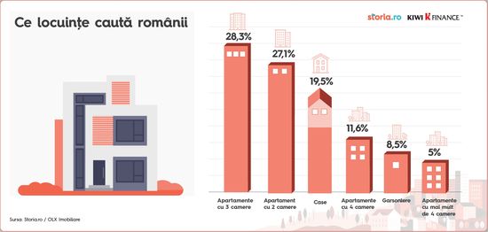 Apartamentele de 3 camere si cele de 2 camere sunt cele mai cautate locuinte, cu ponderi de 28,3%, respectiv de 27,1% din total, iar casele incheie podiumul, cu 19,5%, potrivit datelor din ultimele 12 luni ale Storia.ro, platforma imobiliara cu cele mai multe anunturi. Apartamentele de 4 camere si garsonierele au ponderi mult mai reduse in cautari, de 11,6%, respectiv de 8,5%.