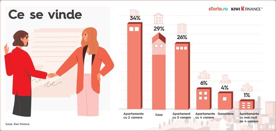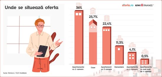 Pe partea de oferta, cele mai multe anunturi de vanzare le cumuleaza apartamentele de 2 camere, cu o pondere de 36% din total, urmate de case, cu 25,7%, si de apartamentele de 3 camere, cu 22,4% din oferte. Garsonierele au o cota de 11,3% in anunturile de vanzari, iar cele de 4 camere o pondere de 4,1%, arata datele Storia.ro.