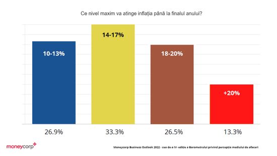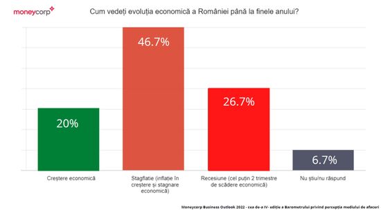 46,7% dintre oamenii de afaceri, manageri si angajati cu functii de conducere din companiile chestionate, partenere Moneycorp, estimeaza ca pana la finele anului, Romania ar putea intra in stagflatie. 26,7% vad un scenariu chiar mai pesimist, considerand ca proeictiile macroeconomice indica o intrare in recesiune. Numai 20% dintre companii sunt optimiste si vad o continuare a cresterii economice.