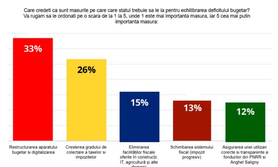 Pe locurile urmatoare, in ordinea importantei indicata de cei chestionati, s-au situat ,cresterea gradului de colectare a taxelor si impozitelor(26%), eliminarea facilitatilor fiscale oferite in constructii, IT, agricultura si alte domenii(15%), schimbarea sistemului fiscal (impozit progresiv) -13% si asigurarea unei utilizari corecte si transparente a fondurilor din PNRR si Anghel Saligny(12%).